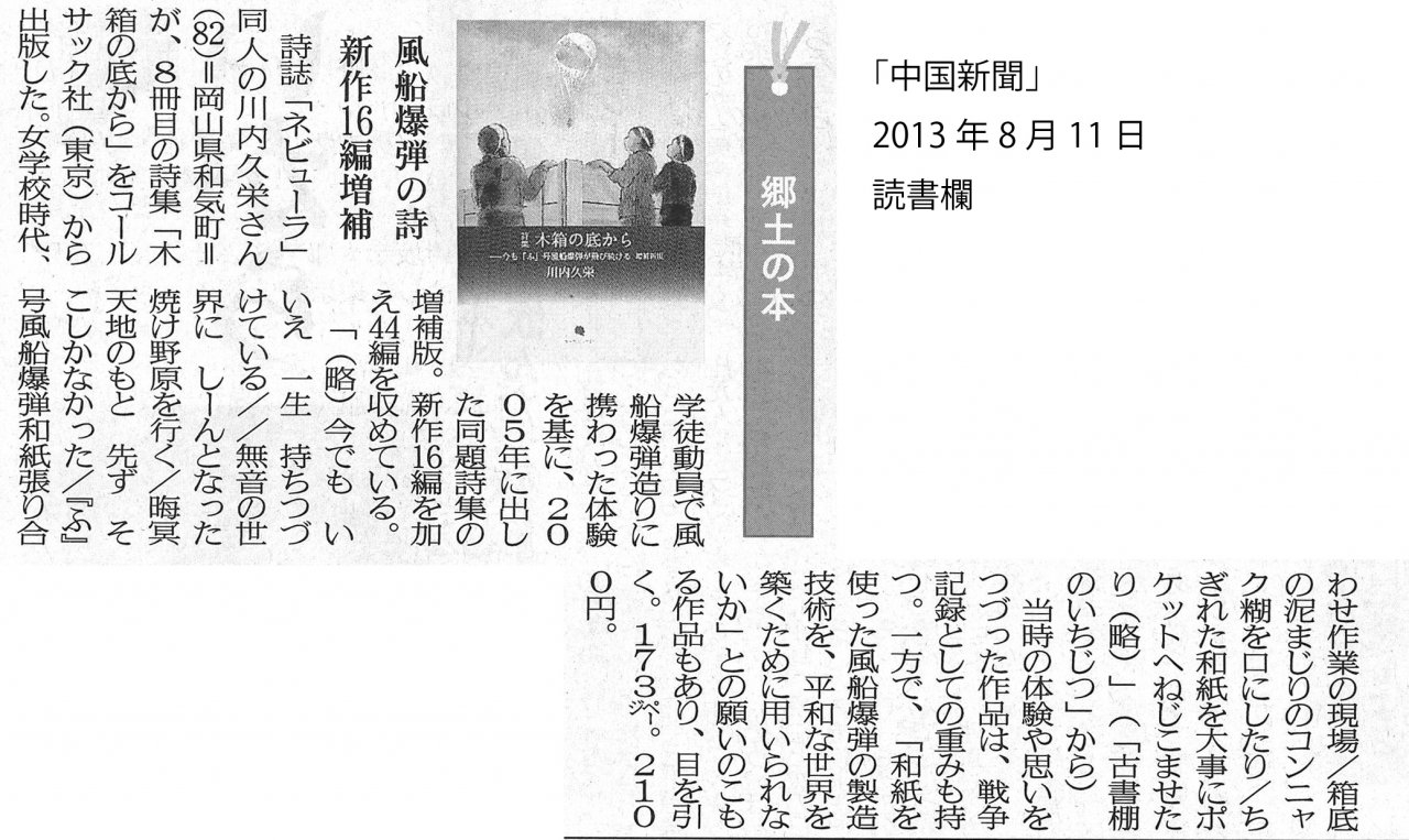 | 2013年08月11日 | 川内久栄詩集『木箱の底から』が中国新聞で紹介されました |