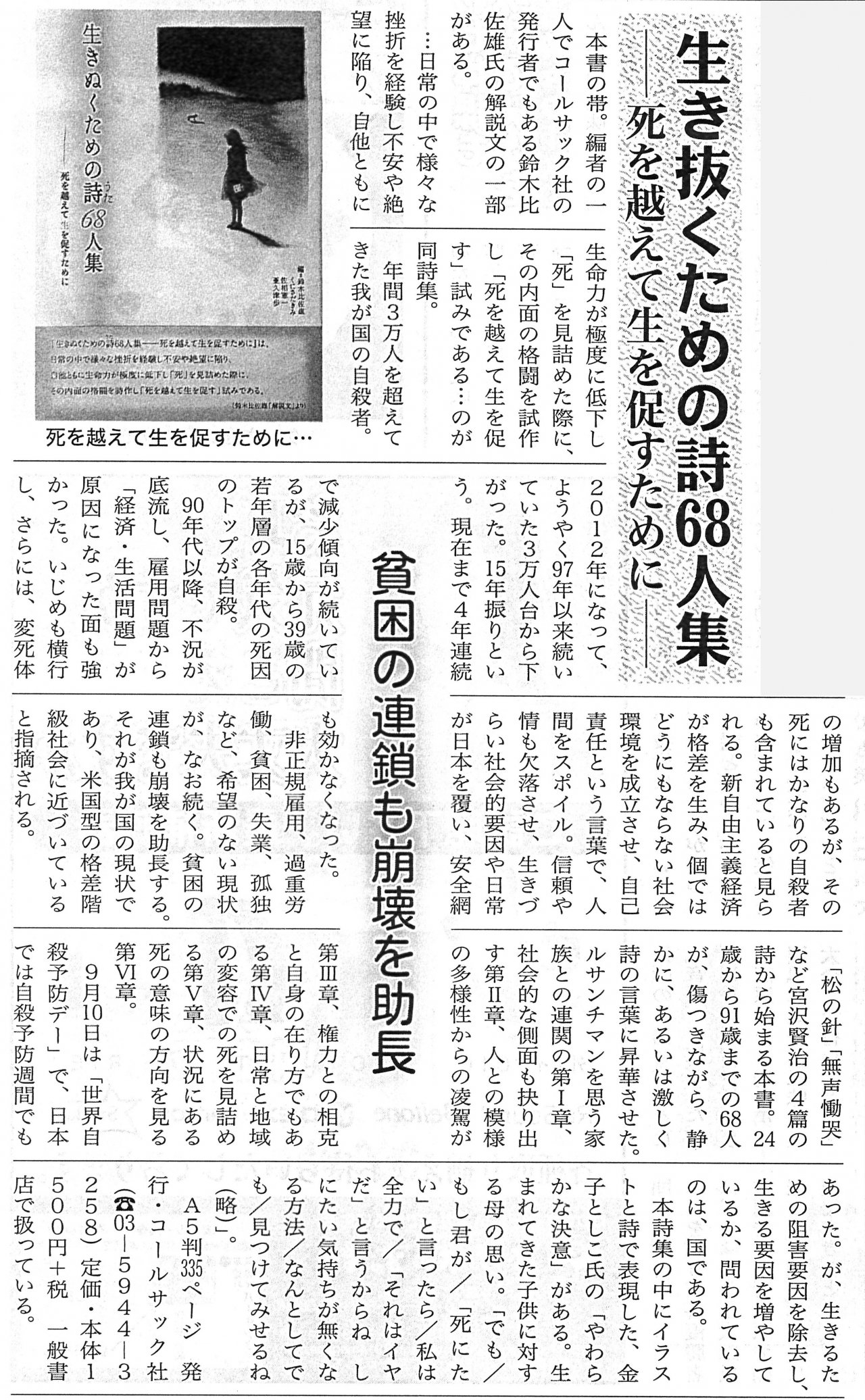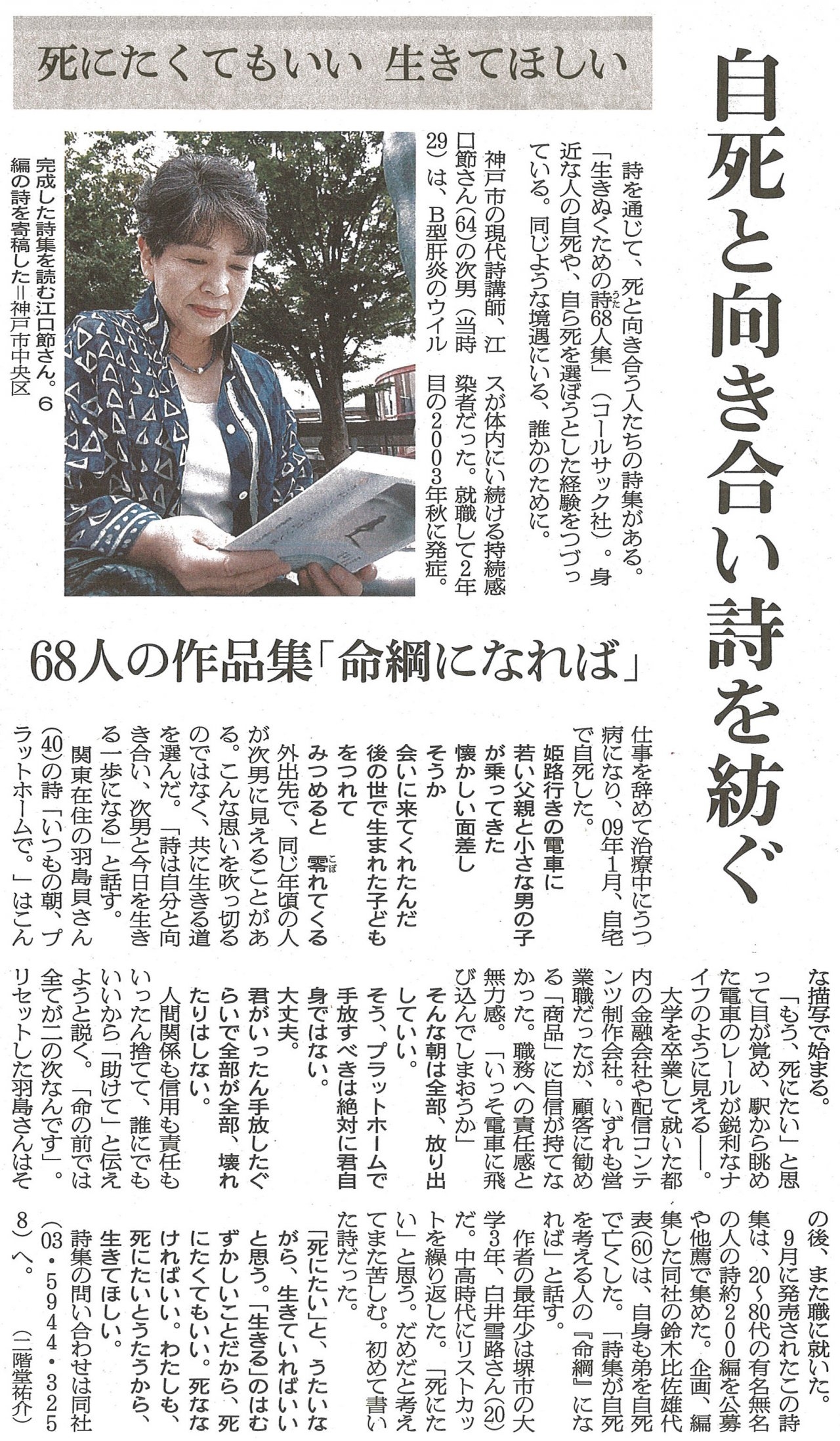 | 2014年11月29日 | 『生きぬくための詩68人集―死を越えて生を促すために』が朝日新聞夕刊で紹介されました |