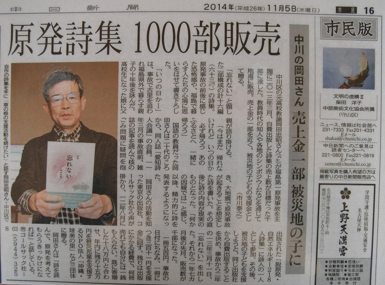 | 2014年11月05日 | 岡田忠昭詩集 『忘れない』が中日新聞で紹介されました |