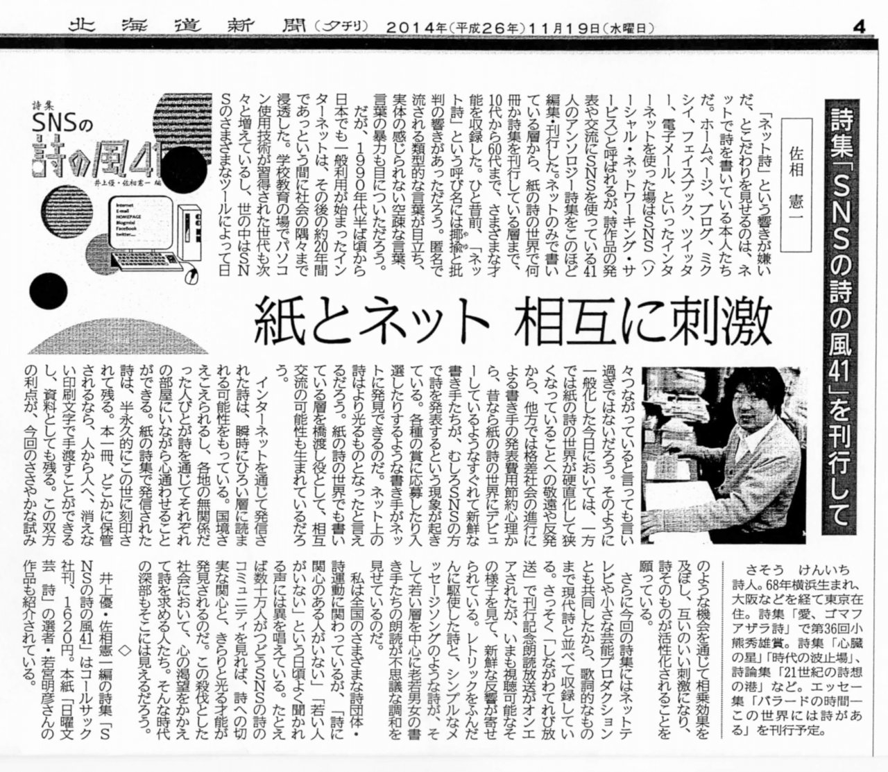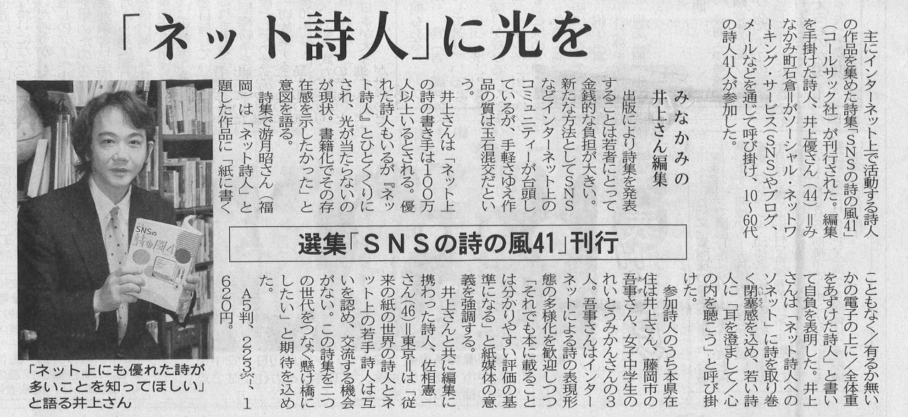 | 2014年11月19日 | アンソロジー詩集『SNSの詩の風41』が北海道新聞夕刊で紹介されました |