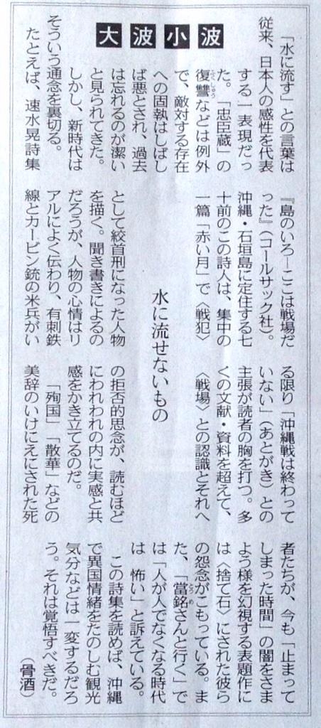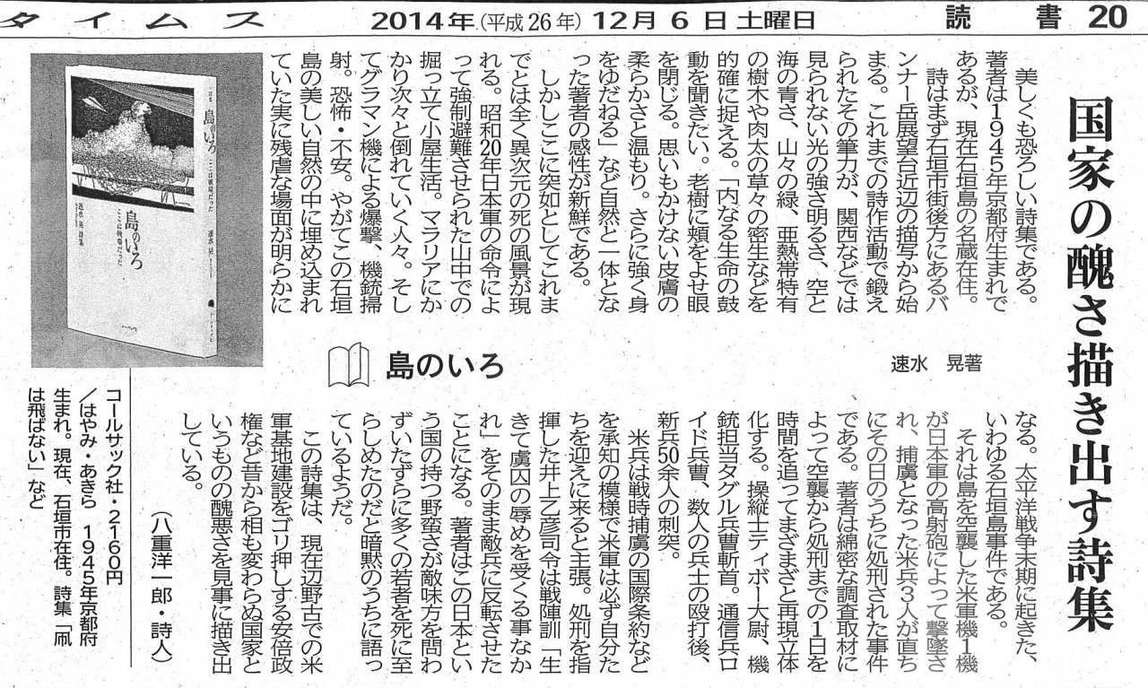 | 2014年12月06日 | 速水晃詩集『島のいろーここは戦場だった』が沖縄タイムスで紹介されました |