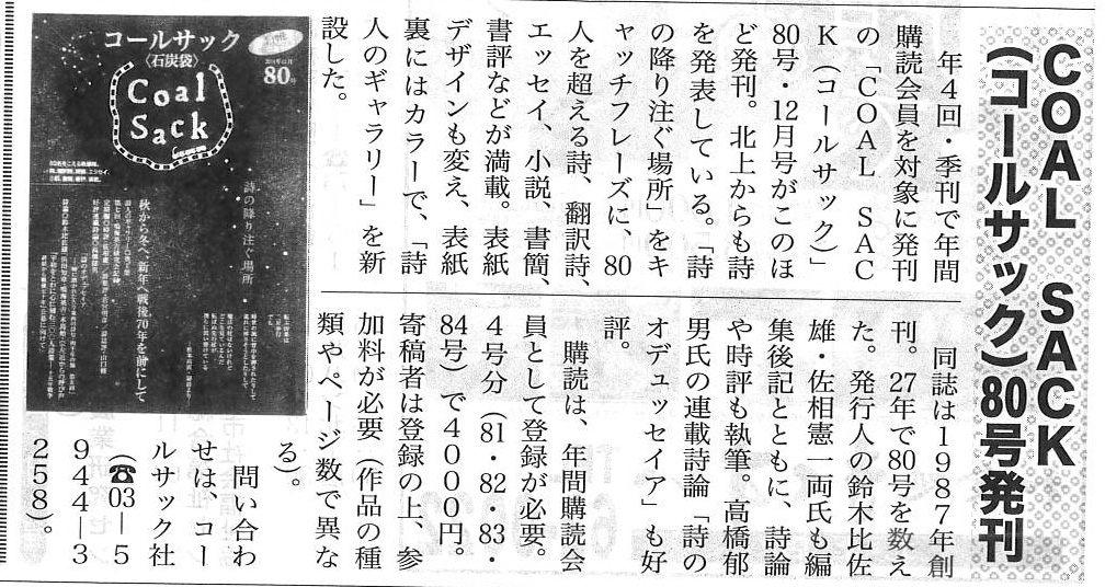 | 2014年12月25日 | 詩誌『コールサック』80号が週刊きたかみで紹介されました |