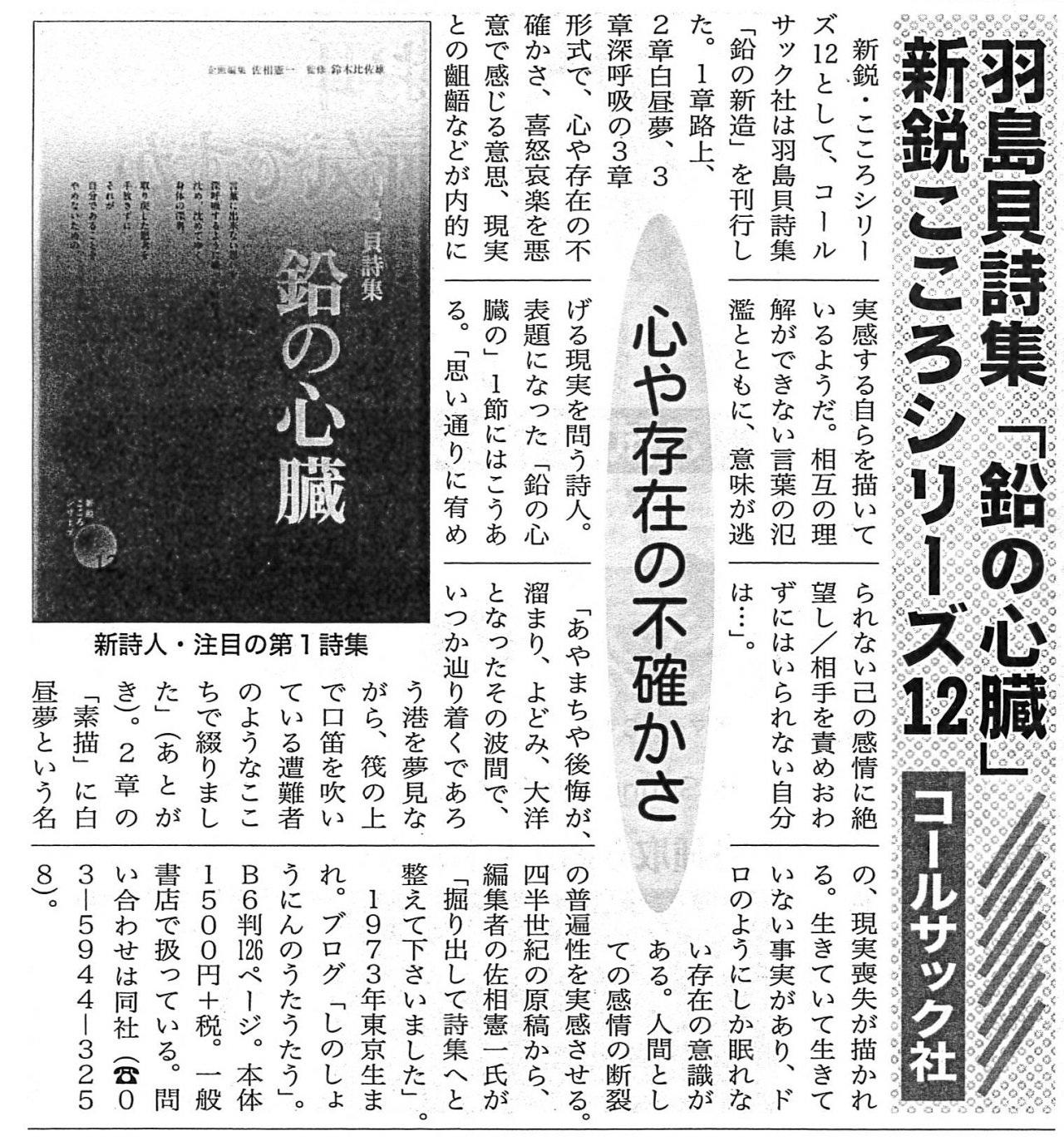 | 2014年05月01日 | 羽島貝詩集『鉛の心臓』が週刊きたかみで紹介されました |