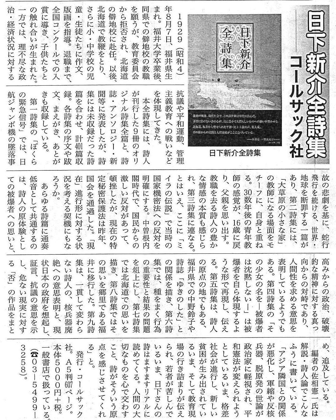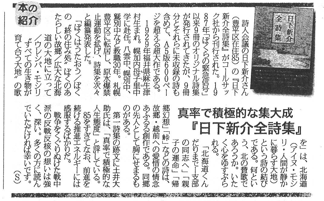 | 2014年05月04日 | 『日下新介全詩集』がほっかい新報で紹介されました |