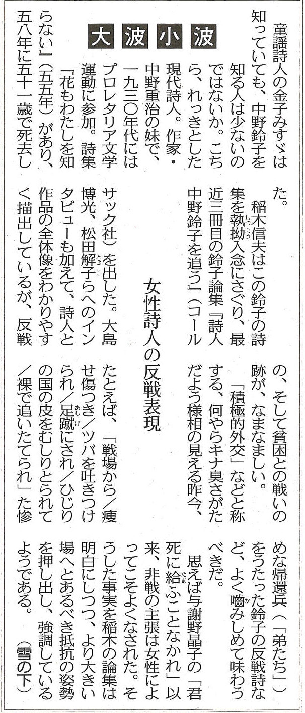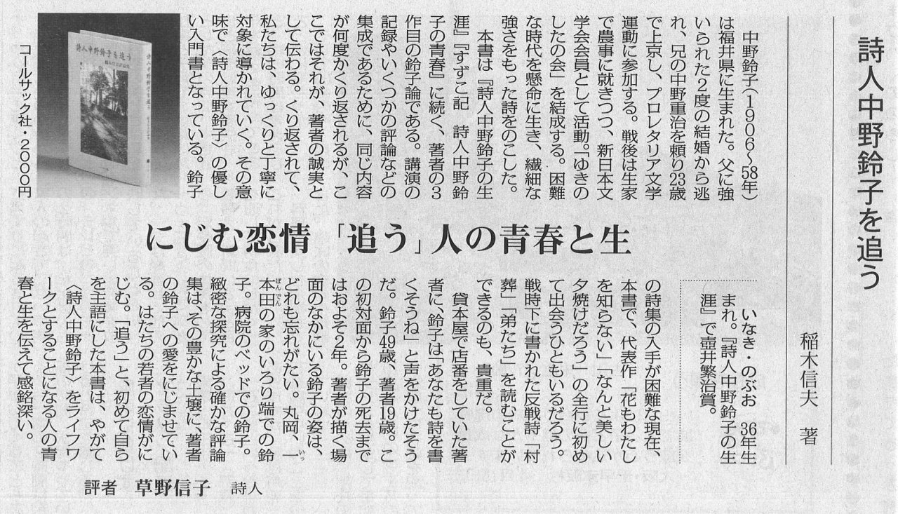 | 2014年03月25日 | 稲木信夫評論集『詩人中野鈴子を追う』が東京新聞で紹介されました |