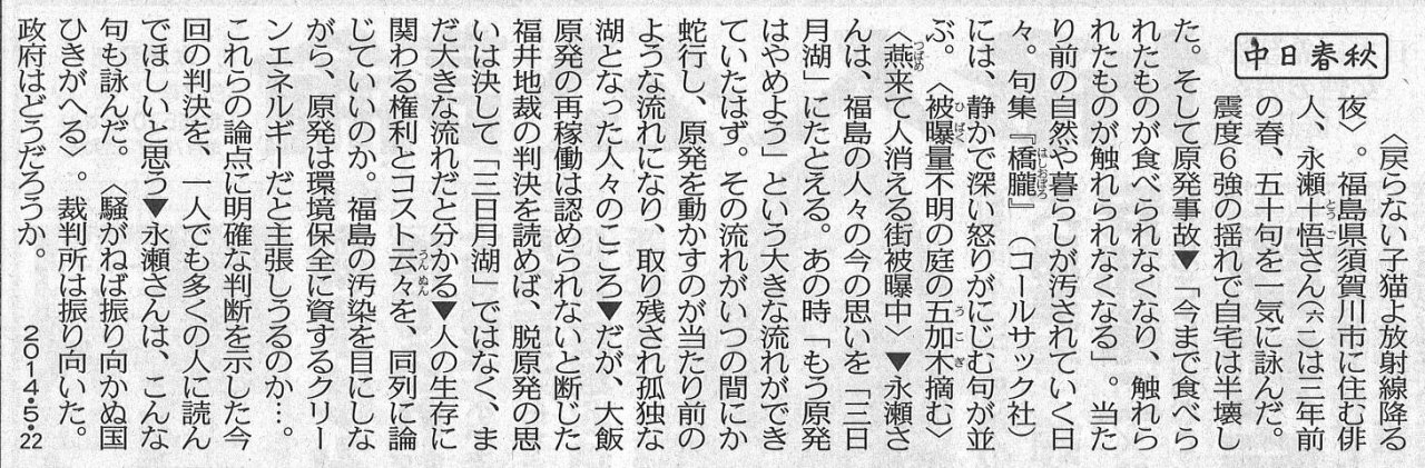 | 2014年05月22日 | 永瀬十悟句集『橋朧―ふくしま記』が中日新聞「中日春秋」で紹介されました |