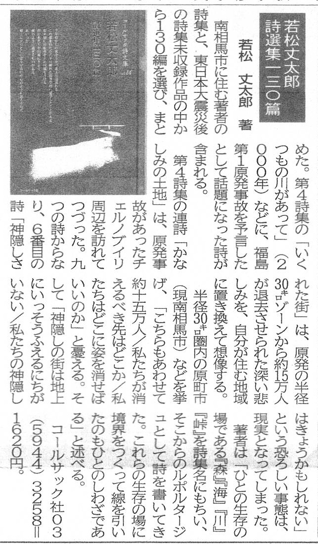 | 2014年04月16日 | 『若松丈太郎詩選集一三〇篇』他2冊が週刊きたかみで紹介されました |