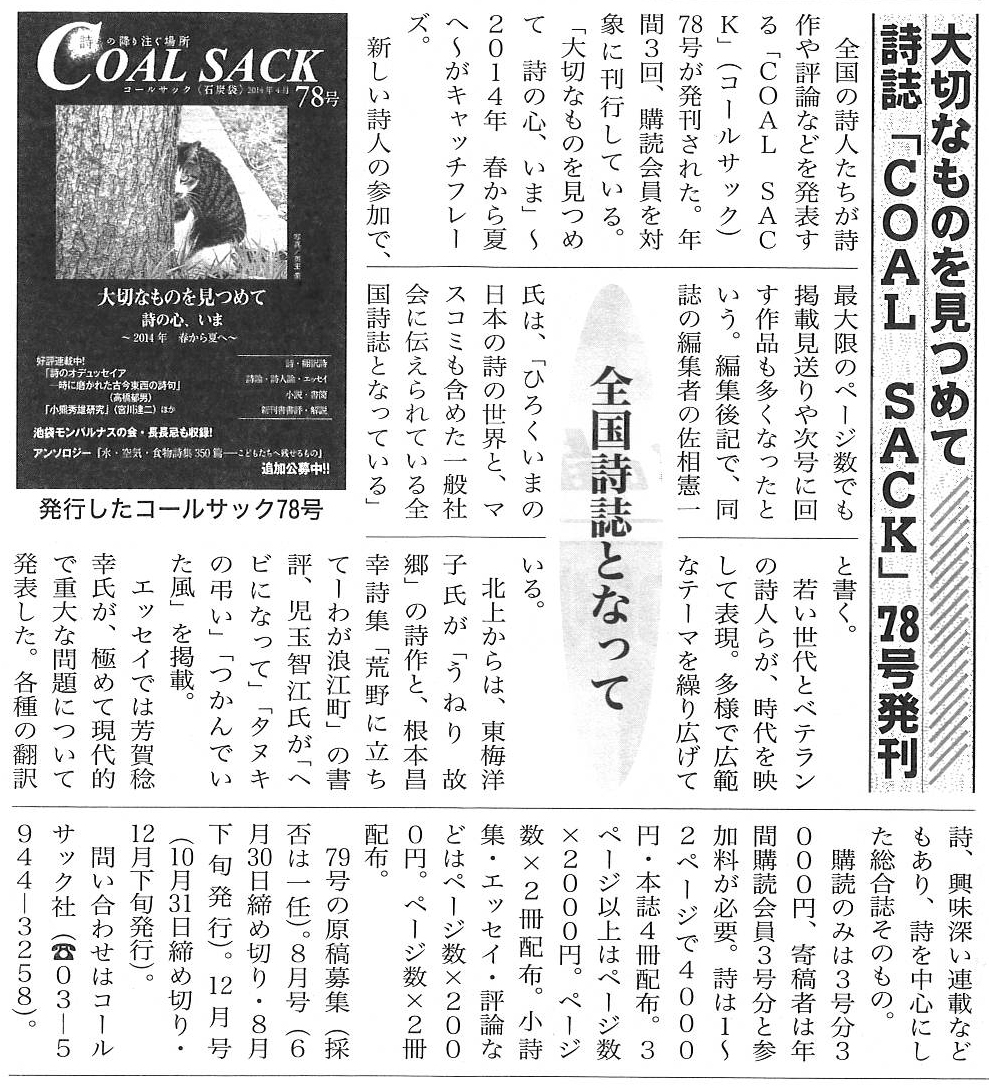 | 2014年06月12日 | 『コールサック(石炭袋)78号』が週刊きたかみで紹介されました |