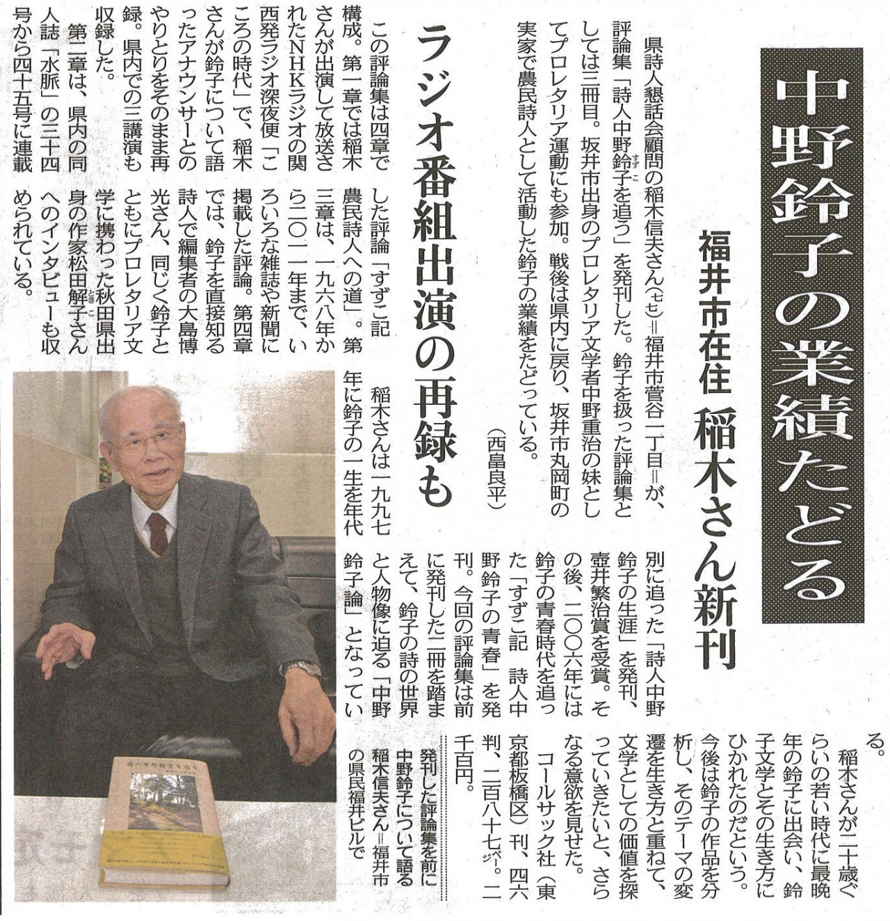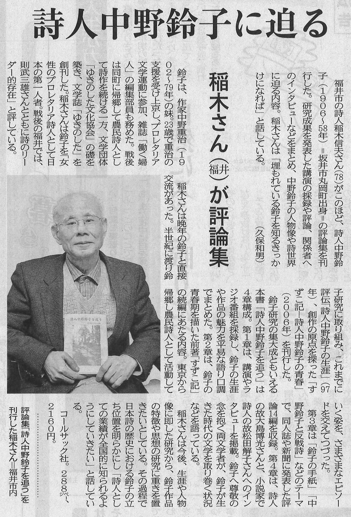 | 2014年04月04日 | 稲木信夫評論集『詩人中野鈴子を追う』が福井新聞で紹介されました |