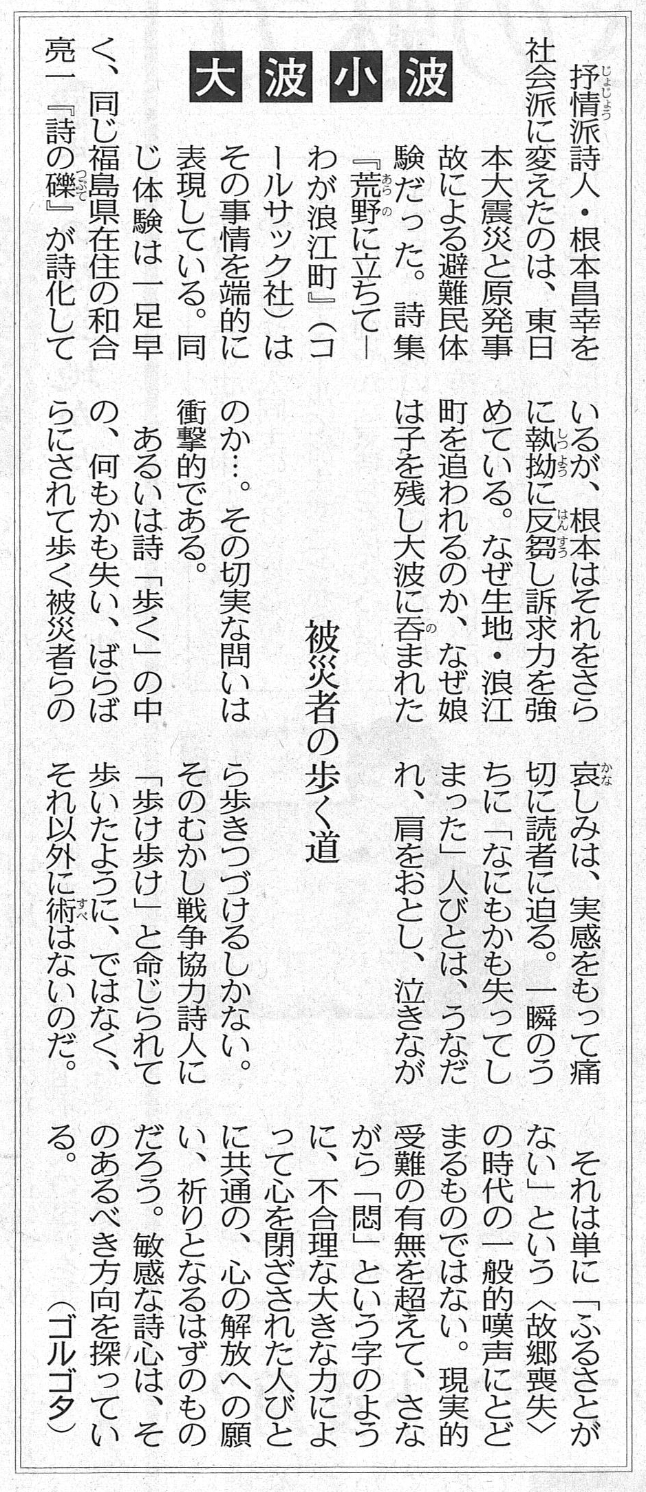 | 2014年04月14日 | 根本昌幸詩集『荒野に立ちて ―わが浪江町』が東京新聞で紹介されました |