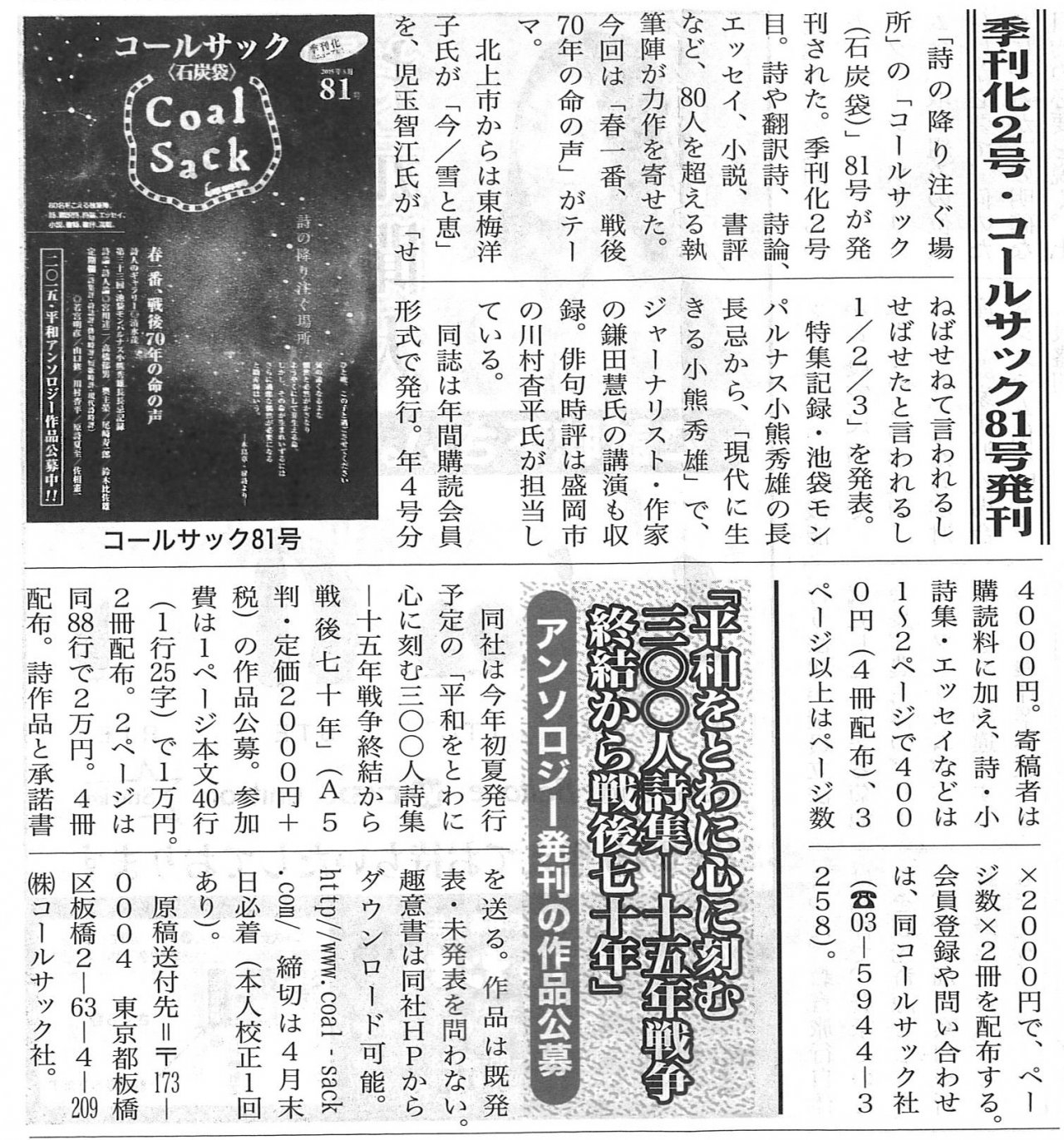 | 2015年04月02日 | 詩誌『コールサック』81号が週刊きたかみで紹介されました |