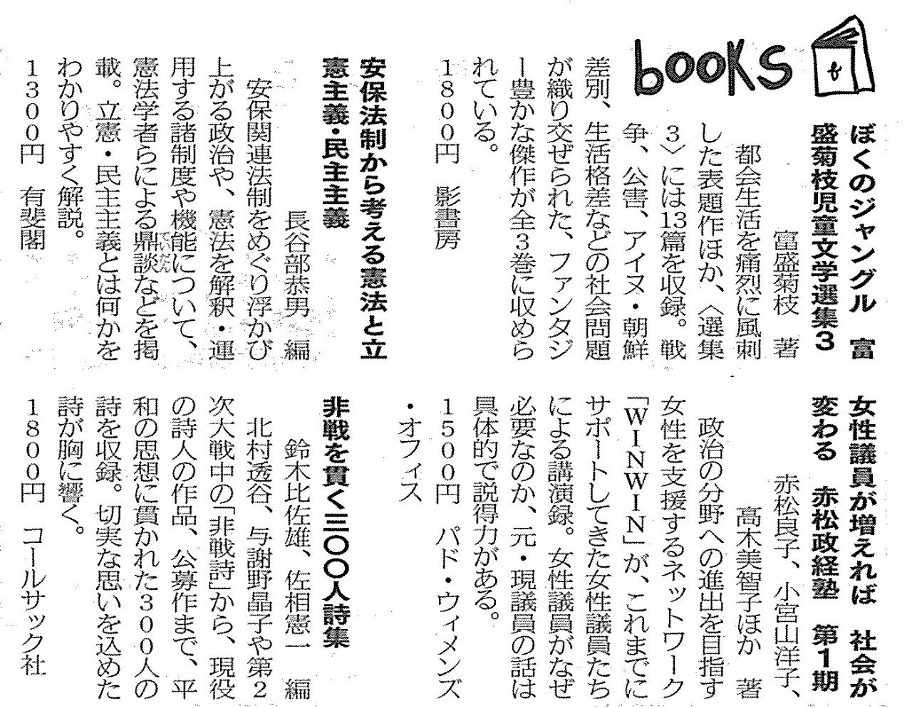| 2016年09月25日 | 『非戦を貫く三〇〇人詩集』がふぇみんで紹介されました |