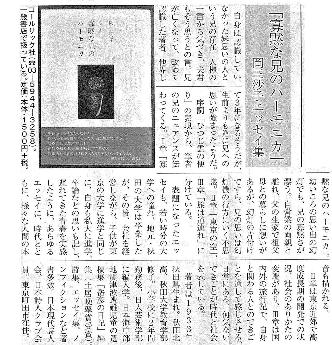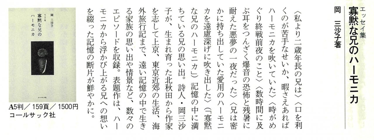 | 2016年10月20日 | 岡三沙子『寡黙な兄のハーモニカ』が週刊きたかみで紹介されました |