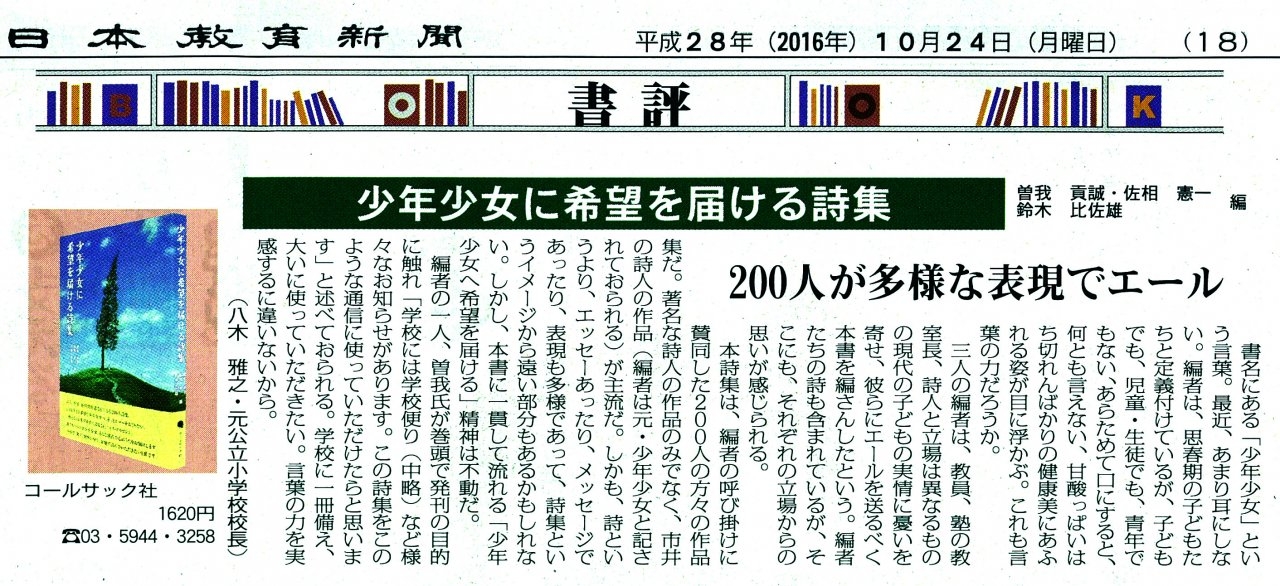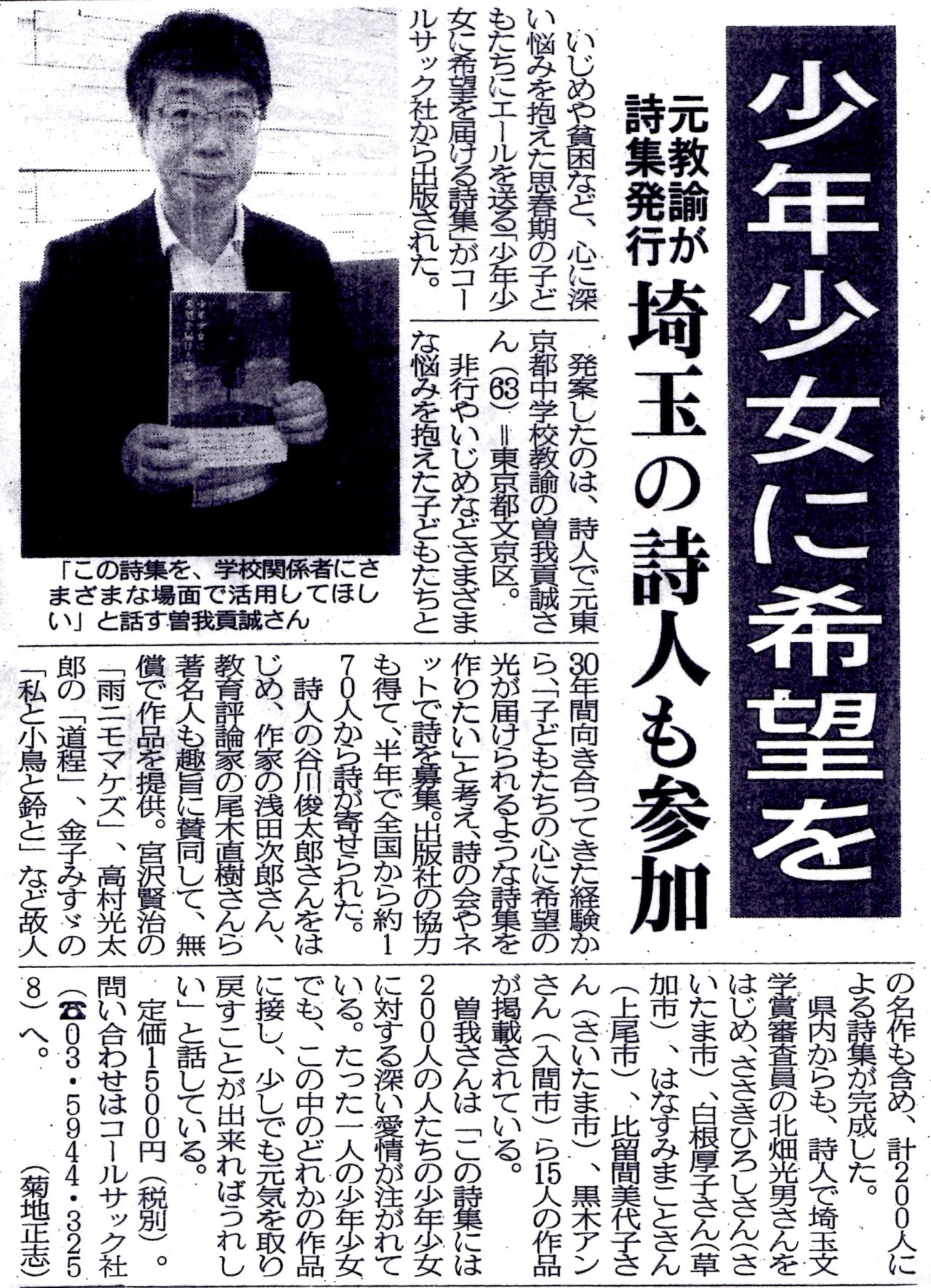 | 2016年10月31日 | 『少年少女に希望を届ける詩集』が埼玉新聞で紹介されました |