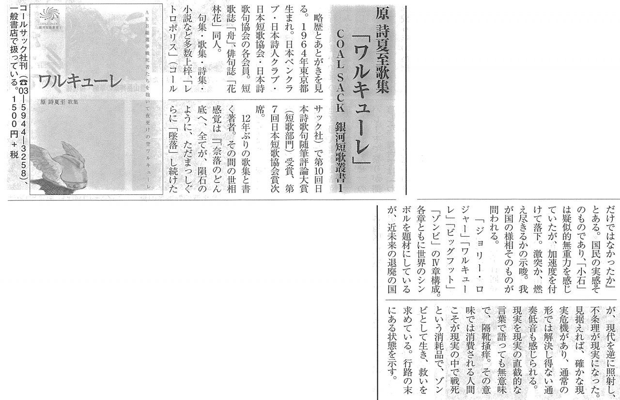 | 2016年10月27日 | COAL SACK 銀河短歌叢書1原 詩夏至 歌集『ワルキューレ』が週刊きたかみで紹介されました |