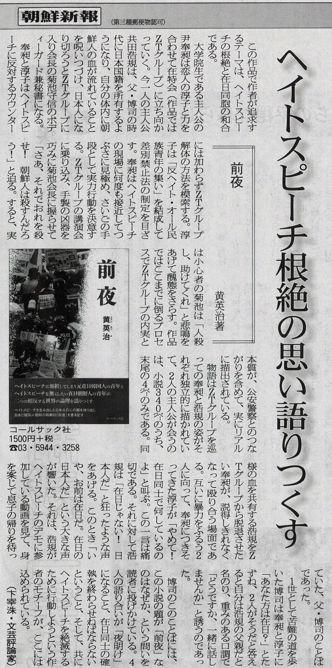 | 2016年10月31日 | 黄英治 小説『前夜』が朝鮮新報で紹介されました |