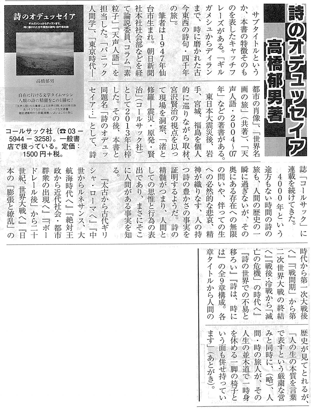 | 2016年11月10日 | 高橋郁男『詩のオデュッセイア―ギルガメシュからディランまで、時に磨かれた古今東西の詩句・四千年の旅』が週刊きたかみで紹介されました |