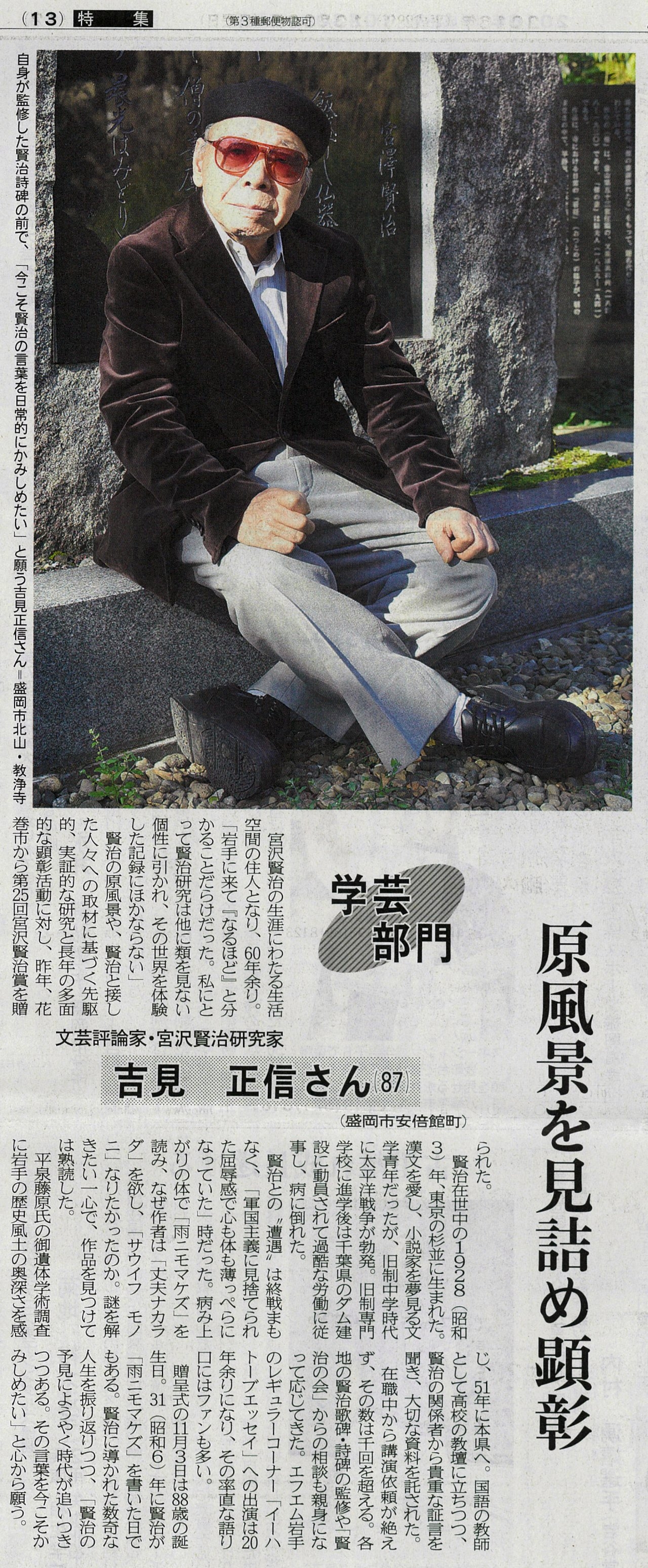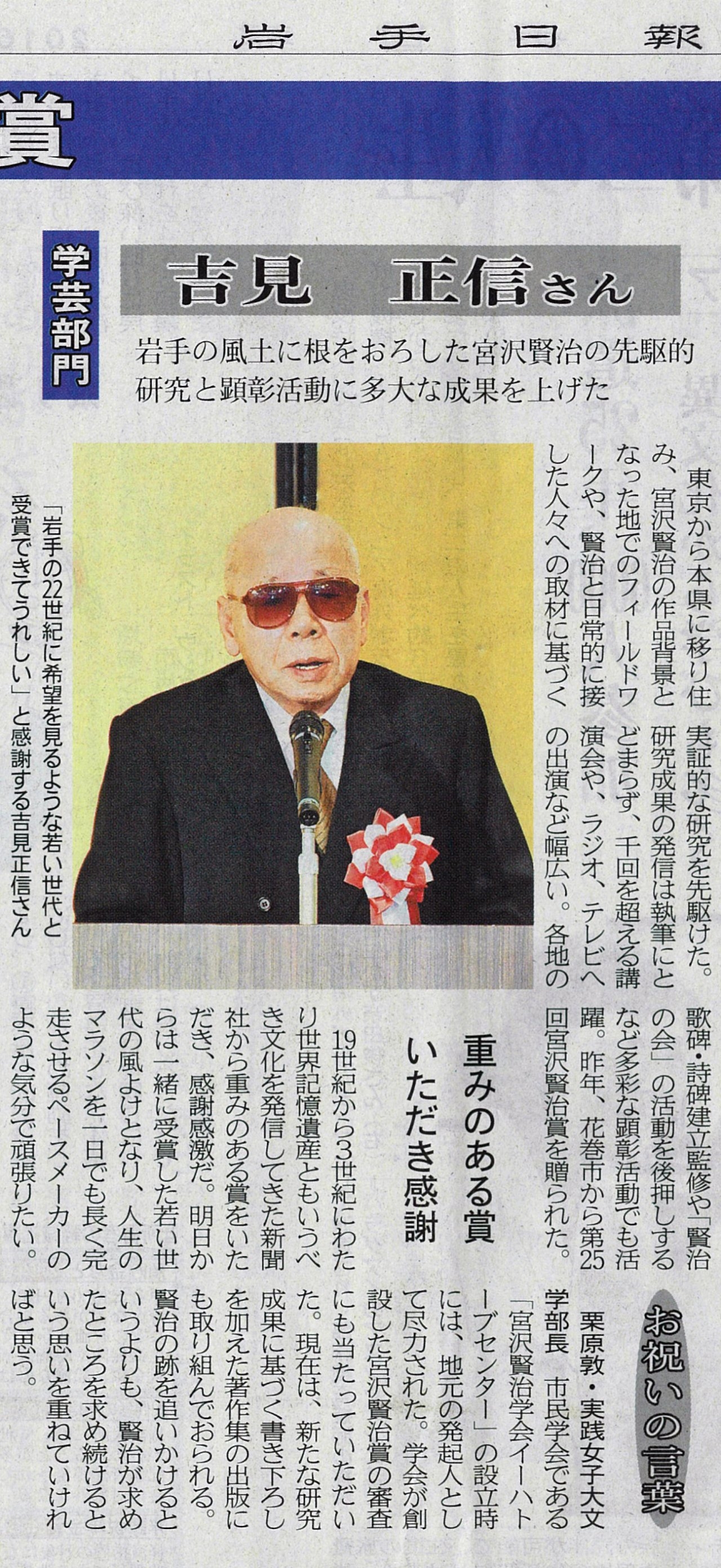 | 2016年11月10日 | 吉見正信 著作集『宮澤賢治の原風景を辿る』の著者吉見正信さんが岩手日報文化賞を受賞されました |