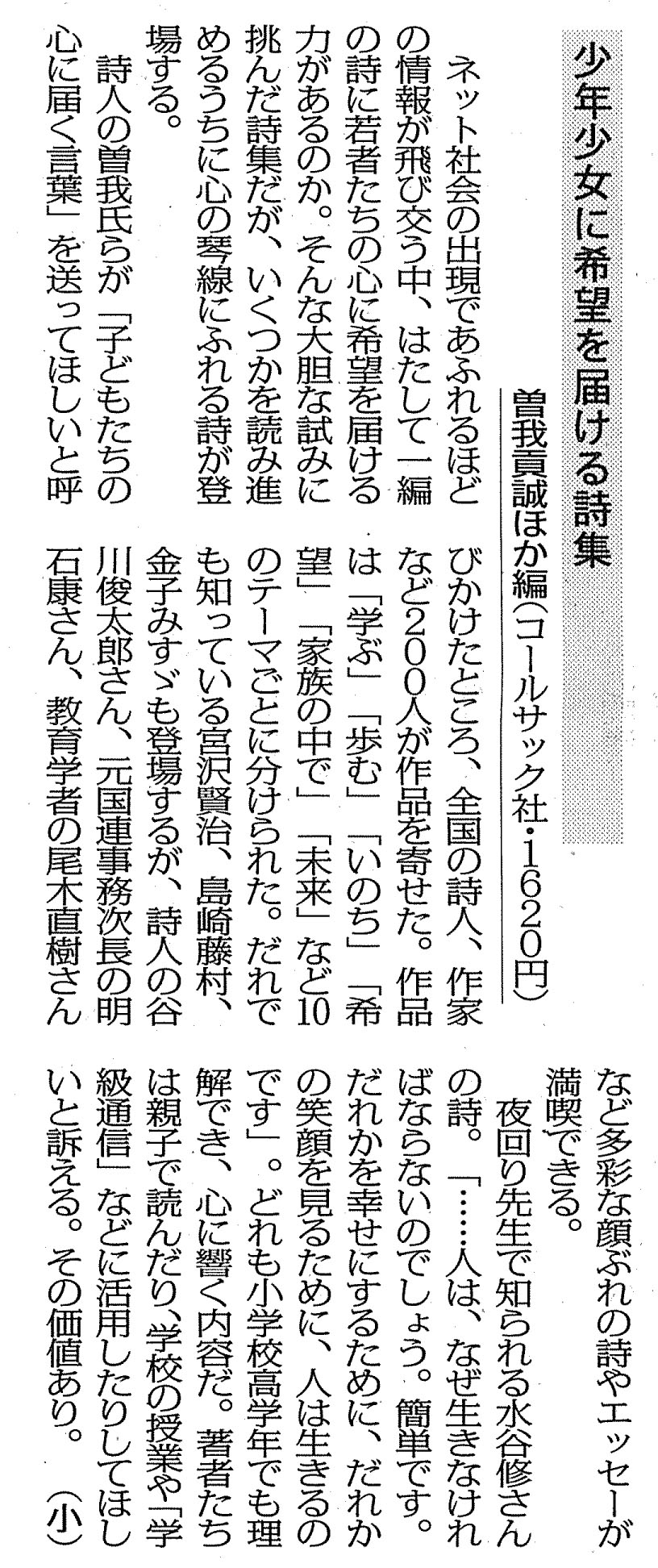 | 2016年12月25日 | 『少年少女に希望を届ける詩集』が毎日新聞で紹介されました |