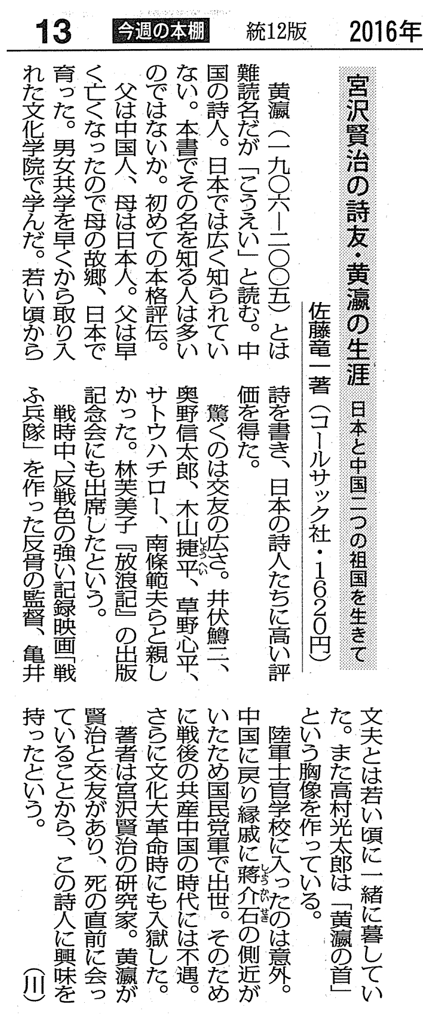 | 2016年08月21日 | 『宮沢賢治の詩友・黄瀛の生涯―日本と中国 二つの祖国を生きて』が毎日新聞で紹介されました |