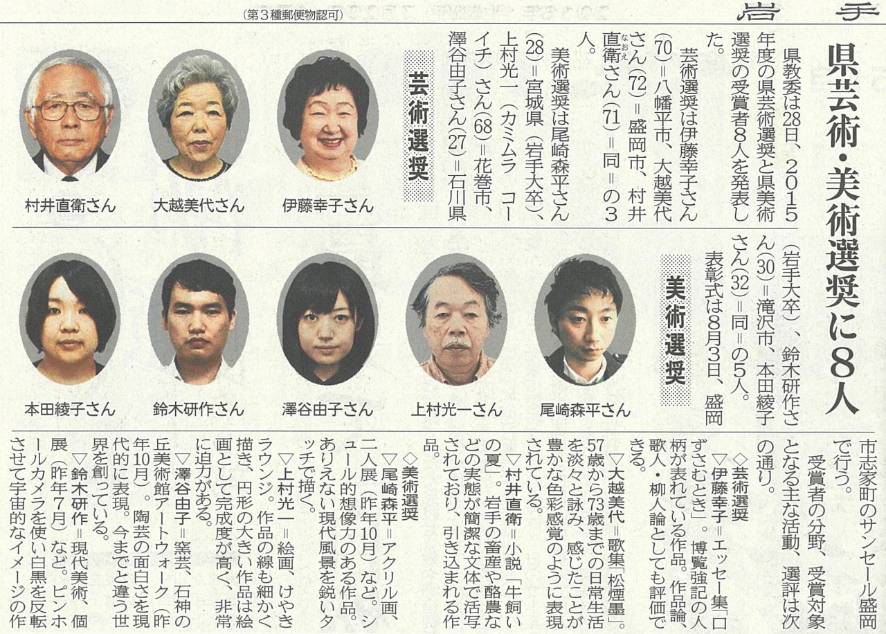 | 2016年07月29日 | 伊藤幸子『口ずさむとき』が岩手日報で紹介されました。平成27年度岩手県芸術選奨受賞! |