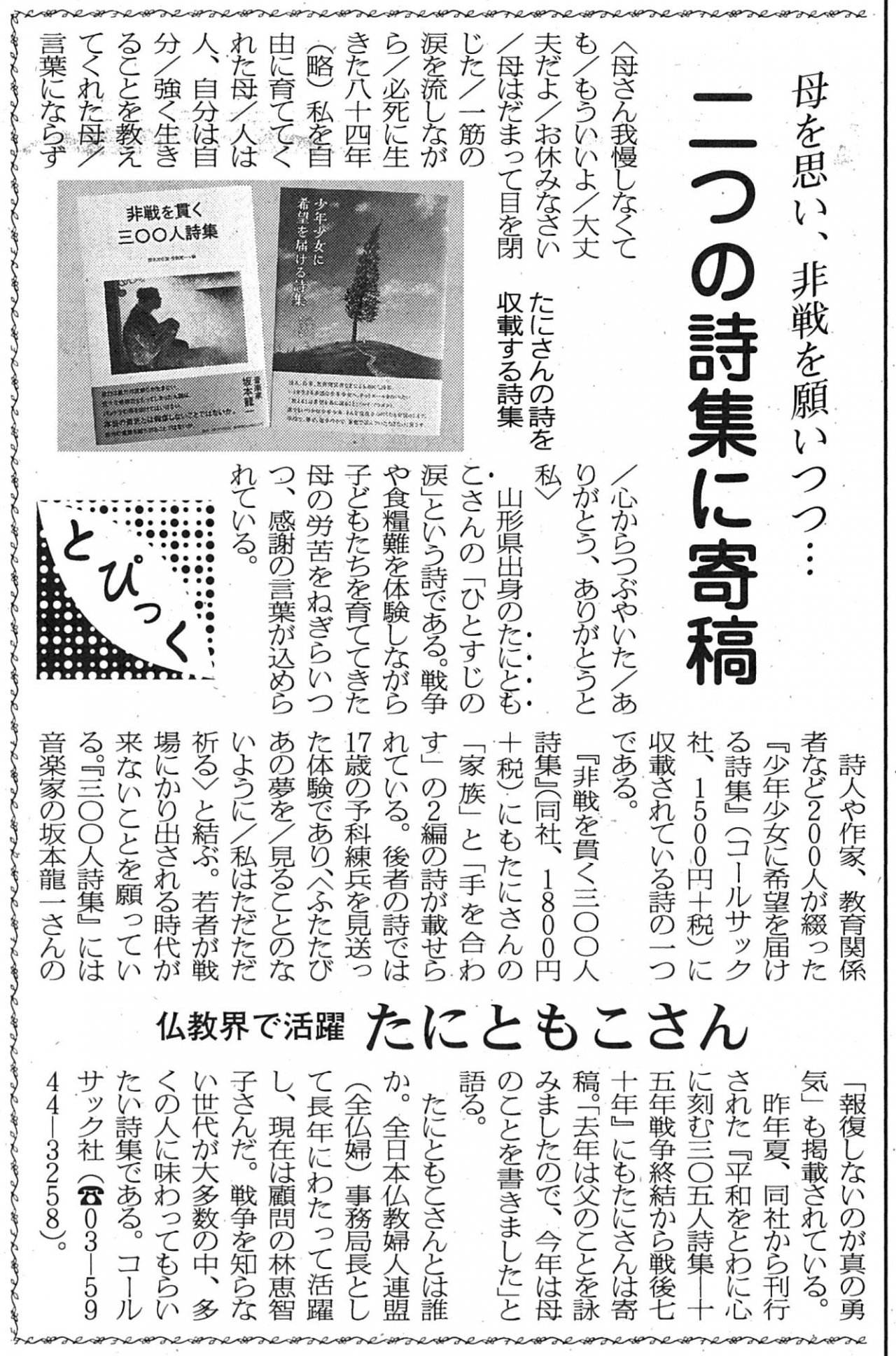 | 2016年08月25日 | 『非戦を貫く三〇〇人詩集』、『少年少女に希望を届ける詩集』が週刊仏教タイムスで紹介されました |