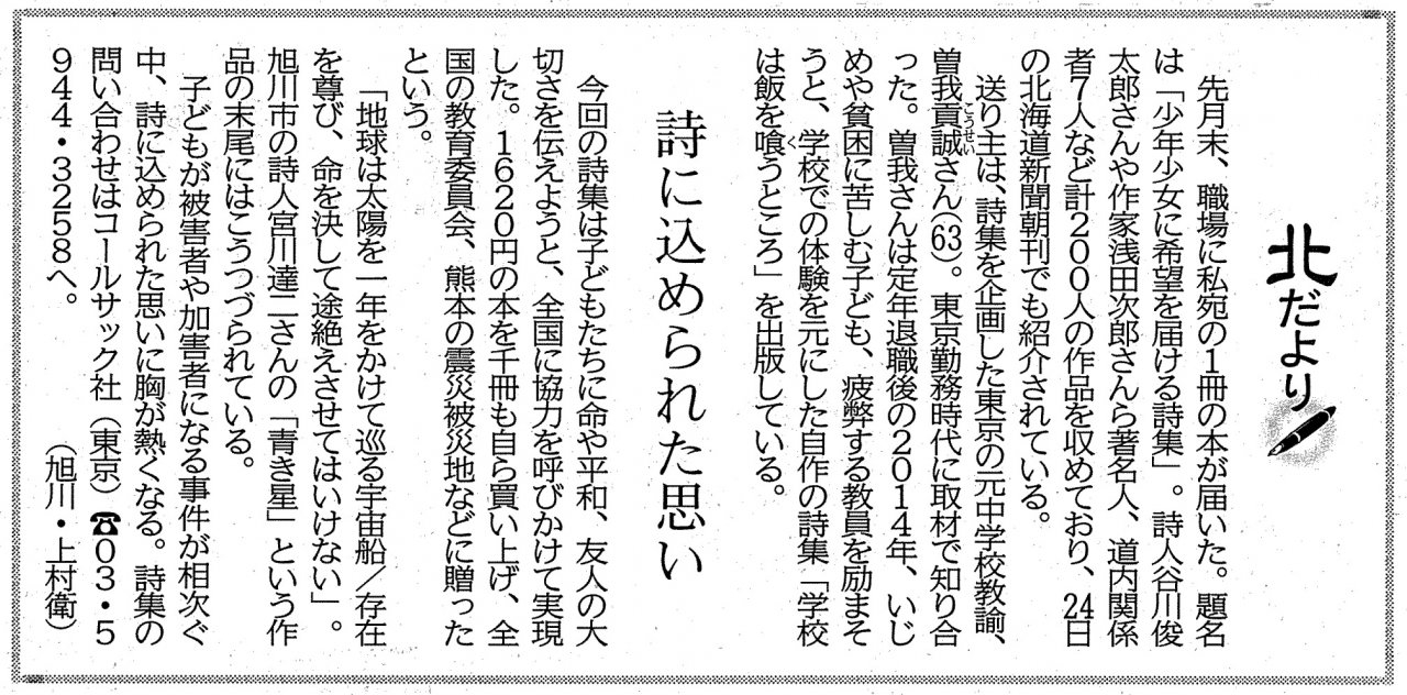 | 2016年08月27日 | 『少年少女に希望を届ける詩集』が8/24北海道新聞、8/27北海道新聞で紹介されました |