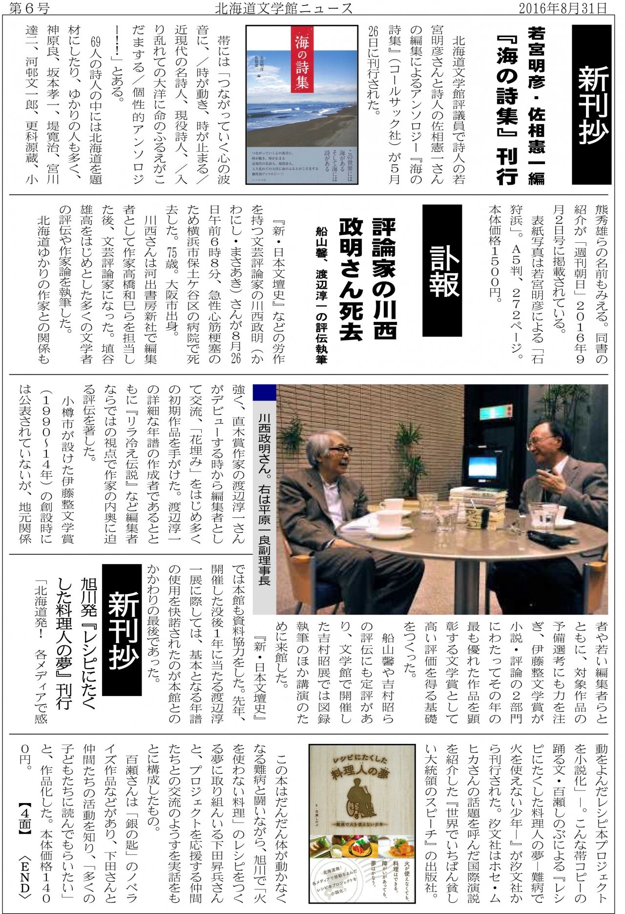 | 2016年09月02日 | アンソロジー詩集『海の詩集』が北海道文学館ニュース第6号で紹介されました |