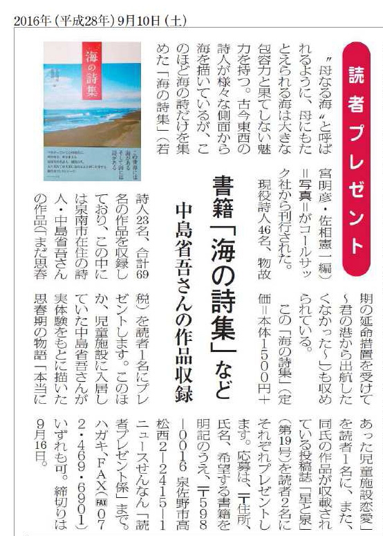 | 2016年09月20日 | アンソロジー詩集『海の詩集』がニュースせんなん で紹介されました |