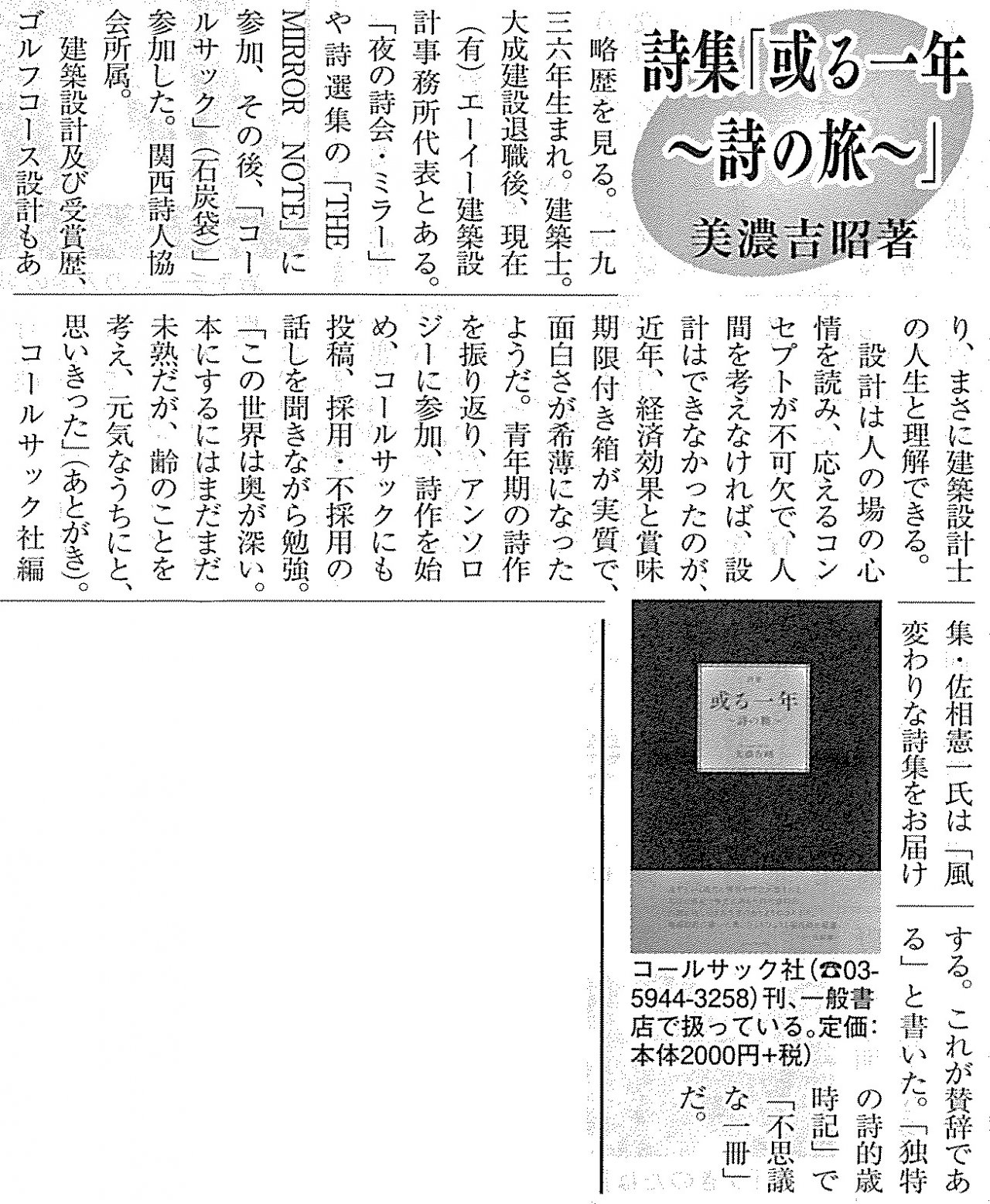 | 2016年09月29日 | 美濃吉昭詩集『或る一年~詩の旅~』が週刊きたかみで紹介されました |