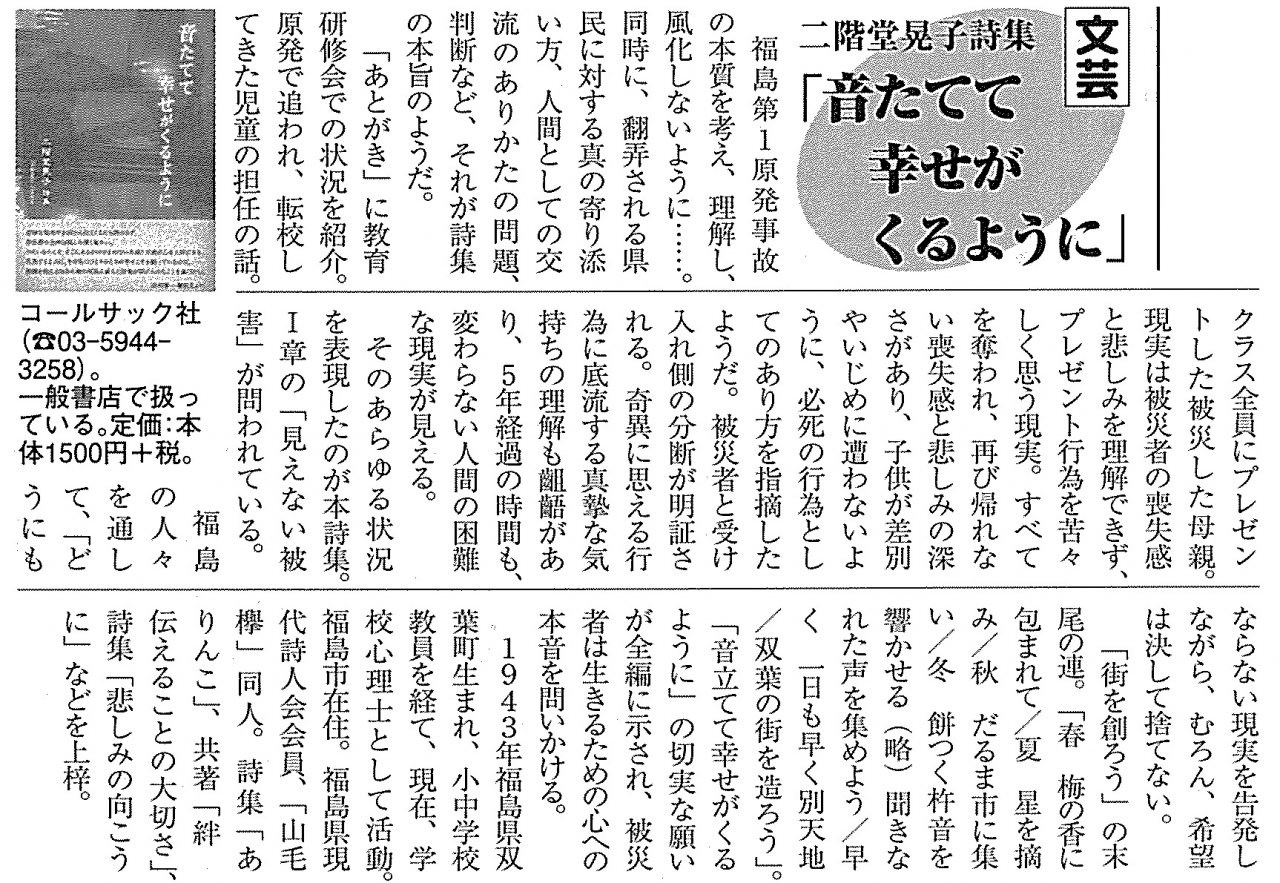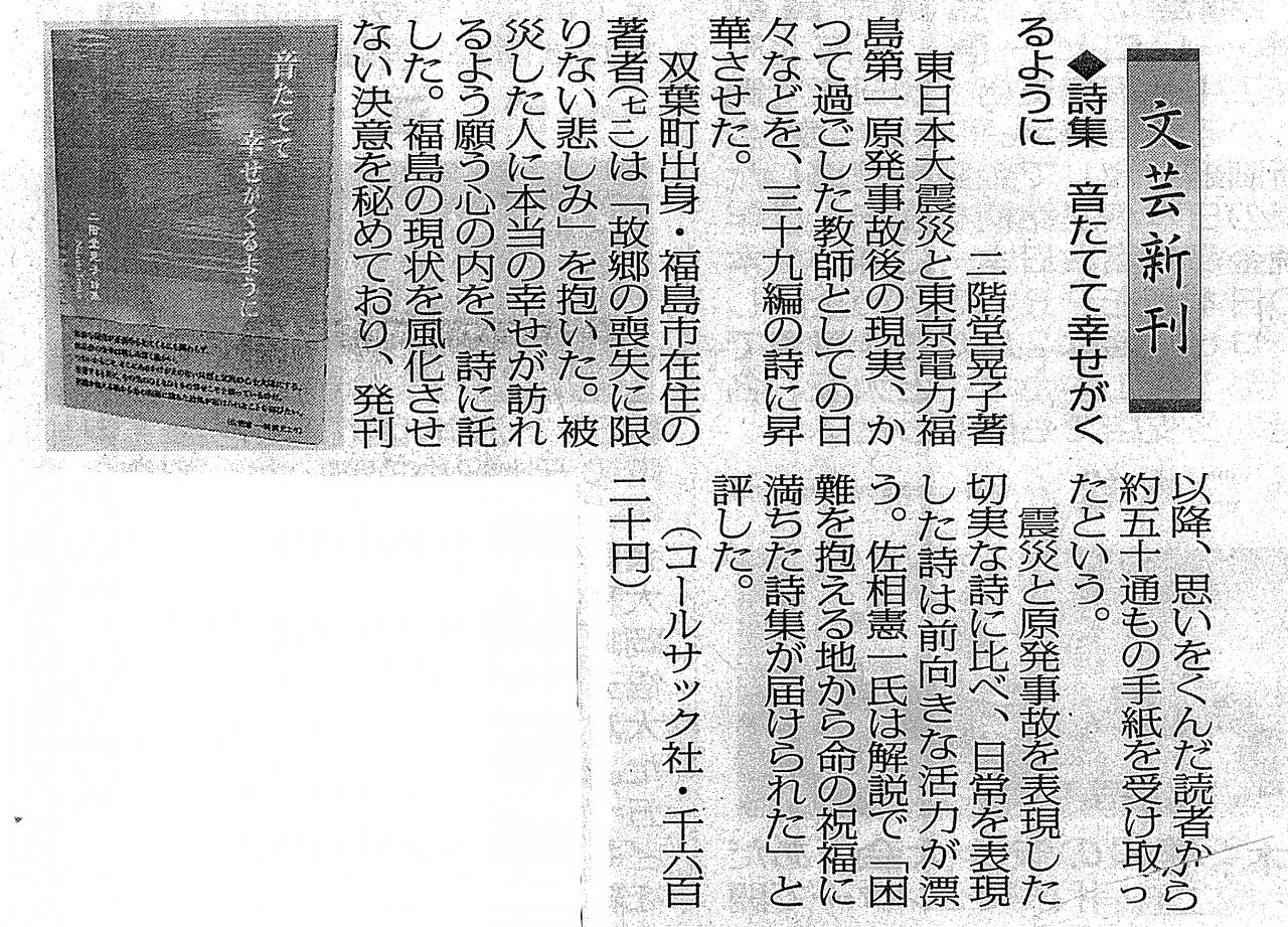 | 2016年05月01日 | 二階堂晃子詩集『音たてて幸せがくるように』が福島民報で紹介されました |