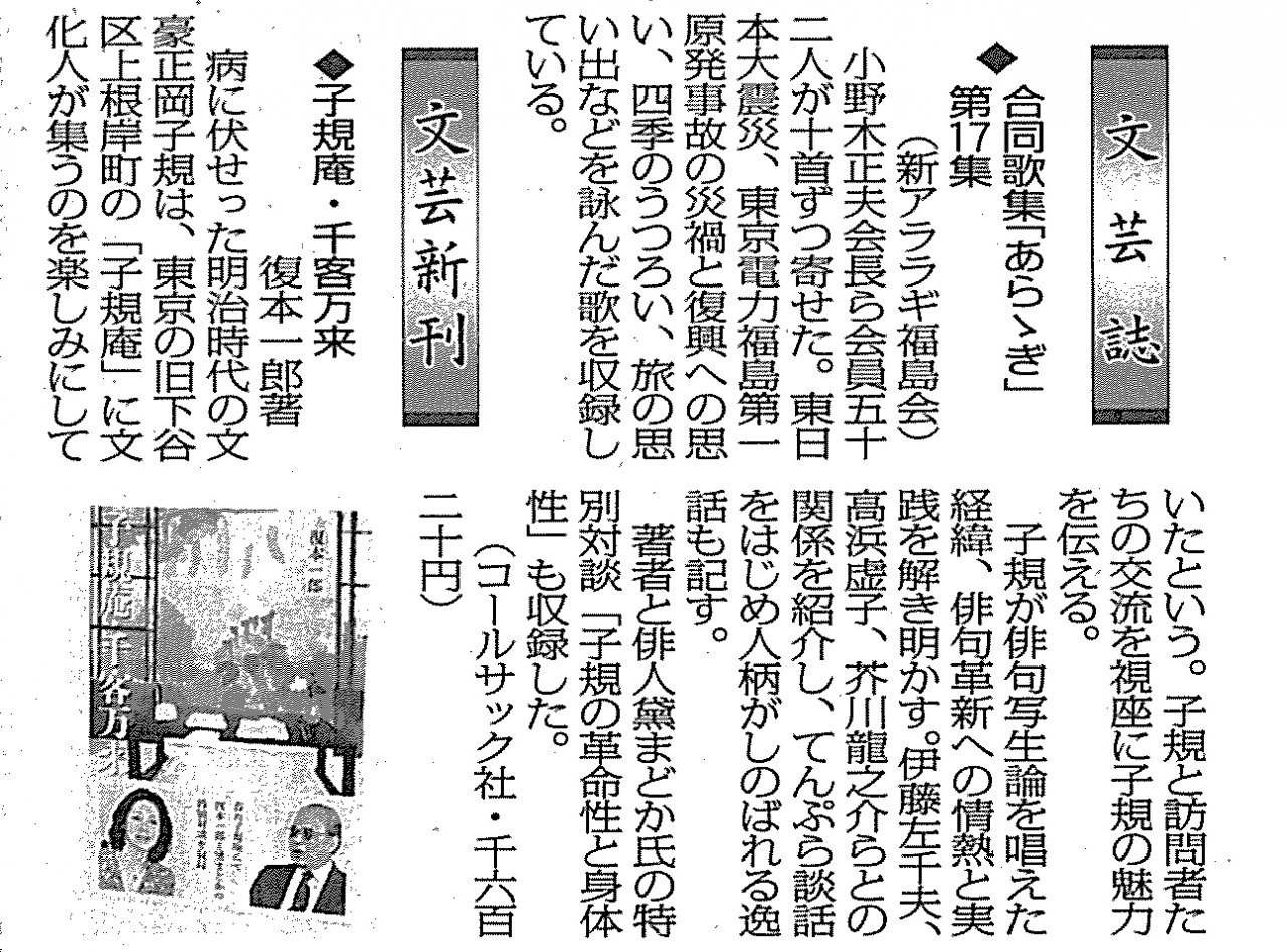 | 2016年06月05日 | 復本一郎『子規庵・千客万来』が福島民報で紹介されました |