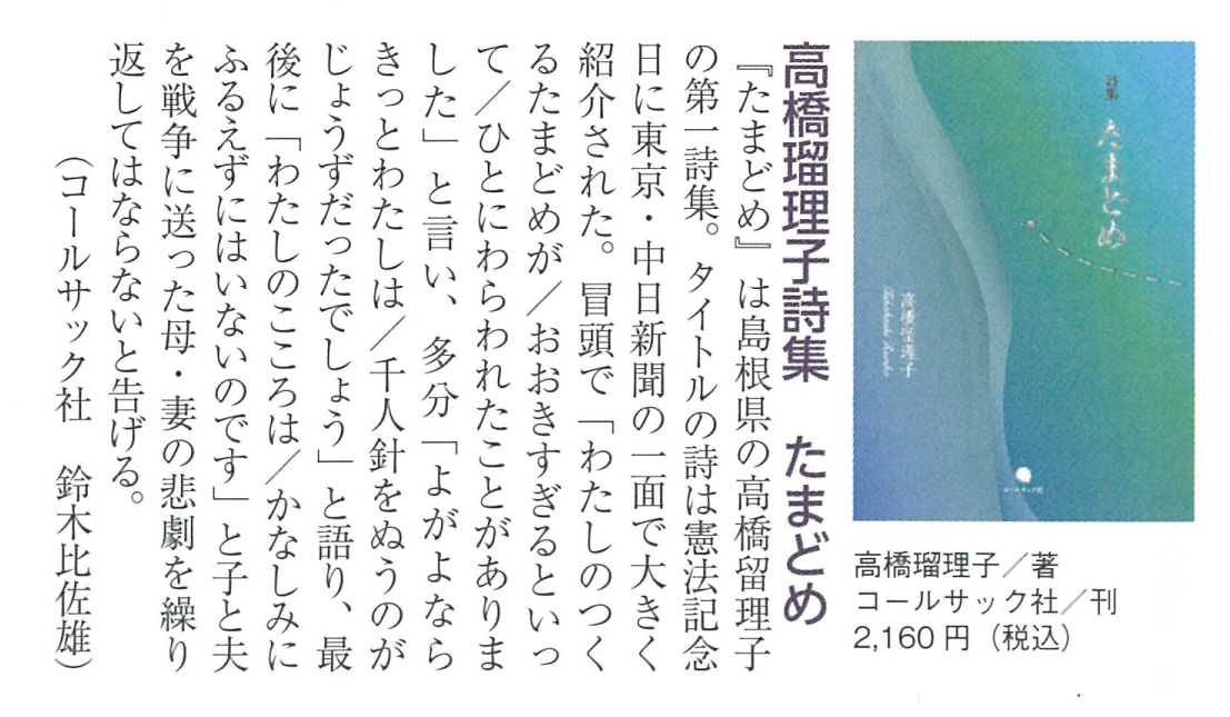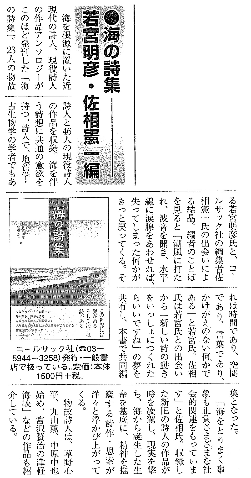 | 2016年06月16日 | アンソロジー詩集『海の詩集』が週刊きたかみで紹介されました |
