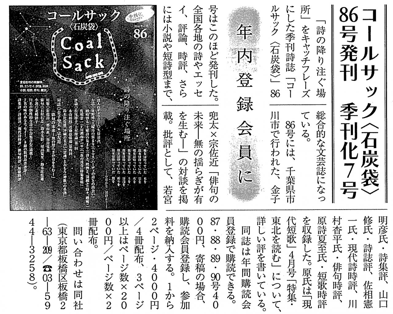 | 2016年07月07日 | 「COALSACK」(石炭袋)86号が週刊きたかみで紹介されました |