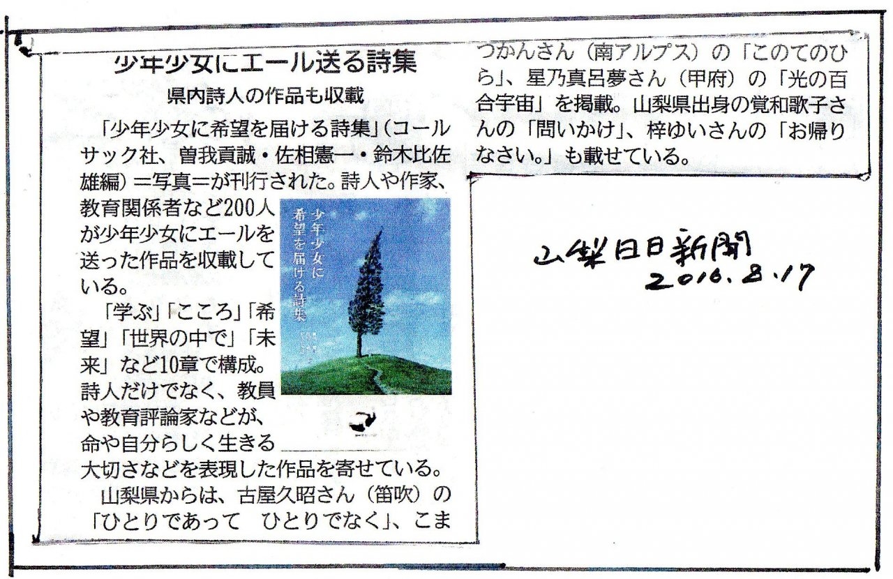 | 2016年08月17日 | 『少年少女に希望を届ける詩集』が山梨日日新聞で紹介されました |