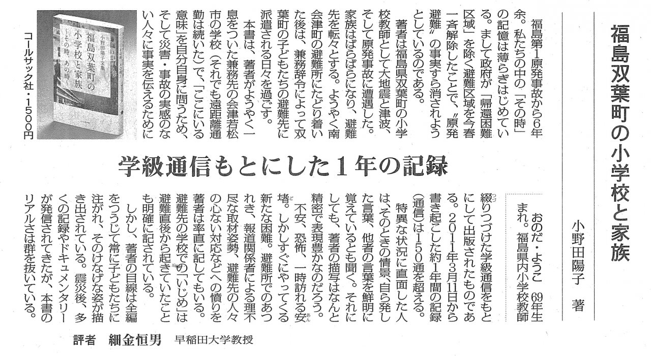 小野田陽子文集『福島双葉町の小学校と家族』