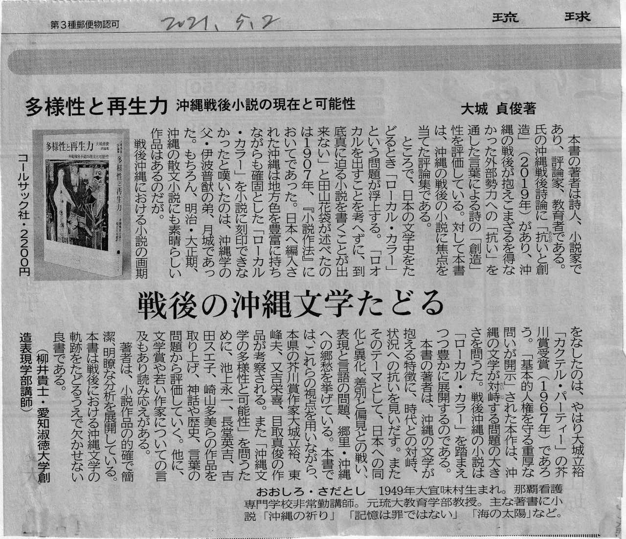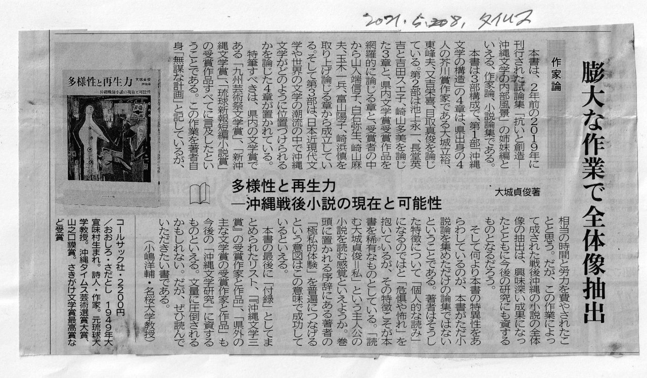 大城貞俊 評論集『多様性と再生力 ―沖縄戦後小説の現在と可能性』