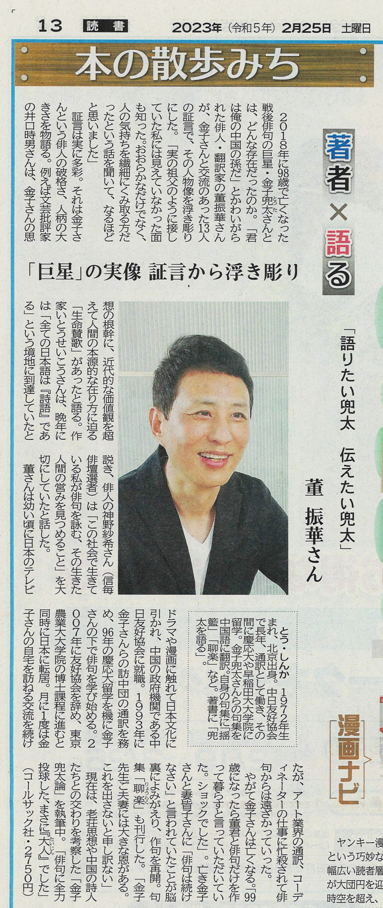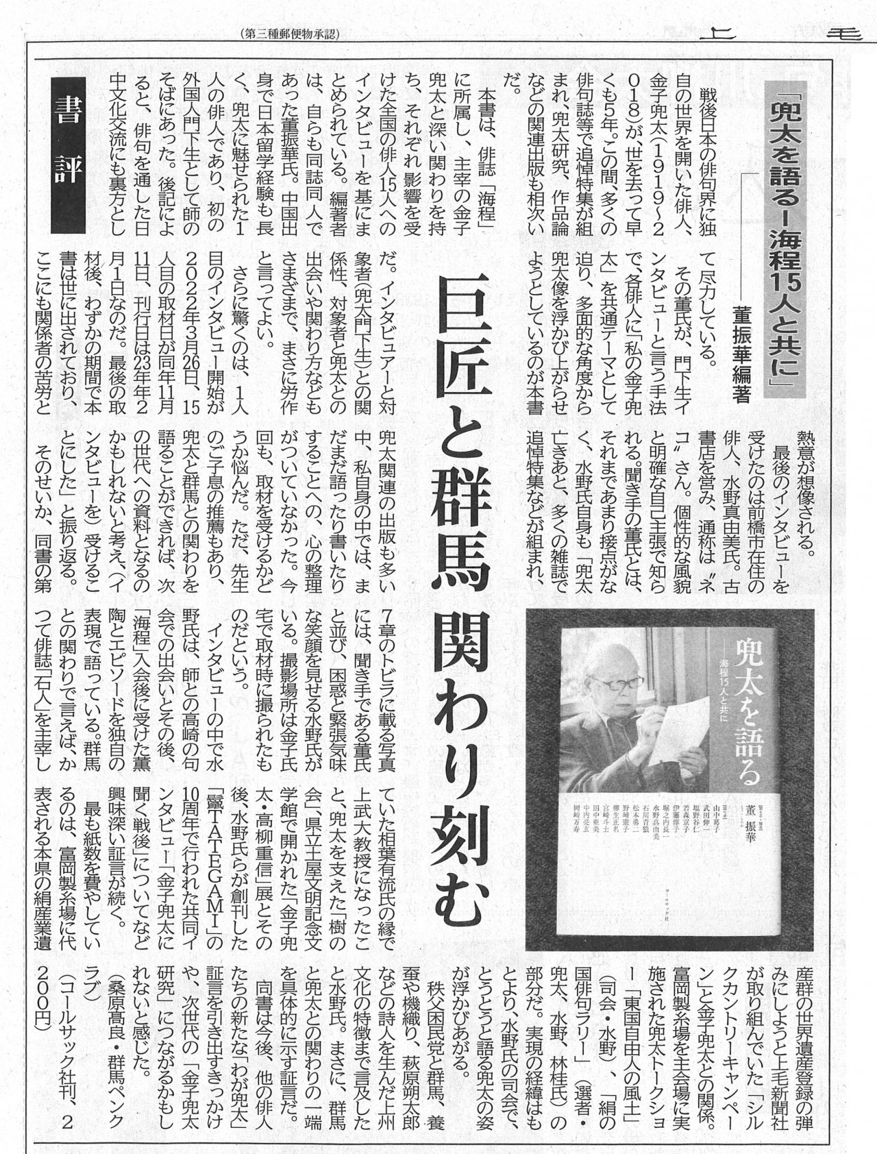 | 2023年03月28日 | 董振華 『兜太を語る ―海程15人と共に』が、上毛新聞で取り上げられました |