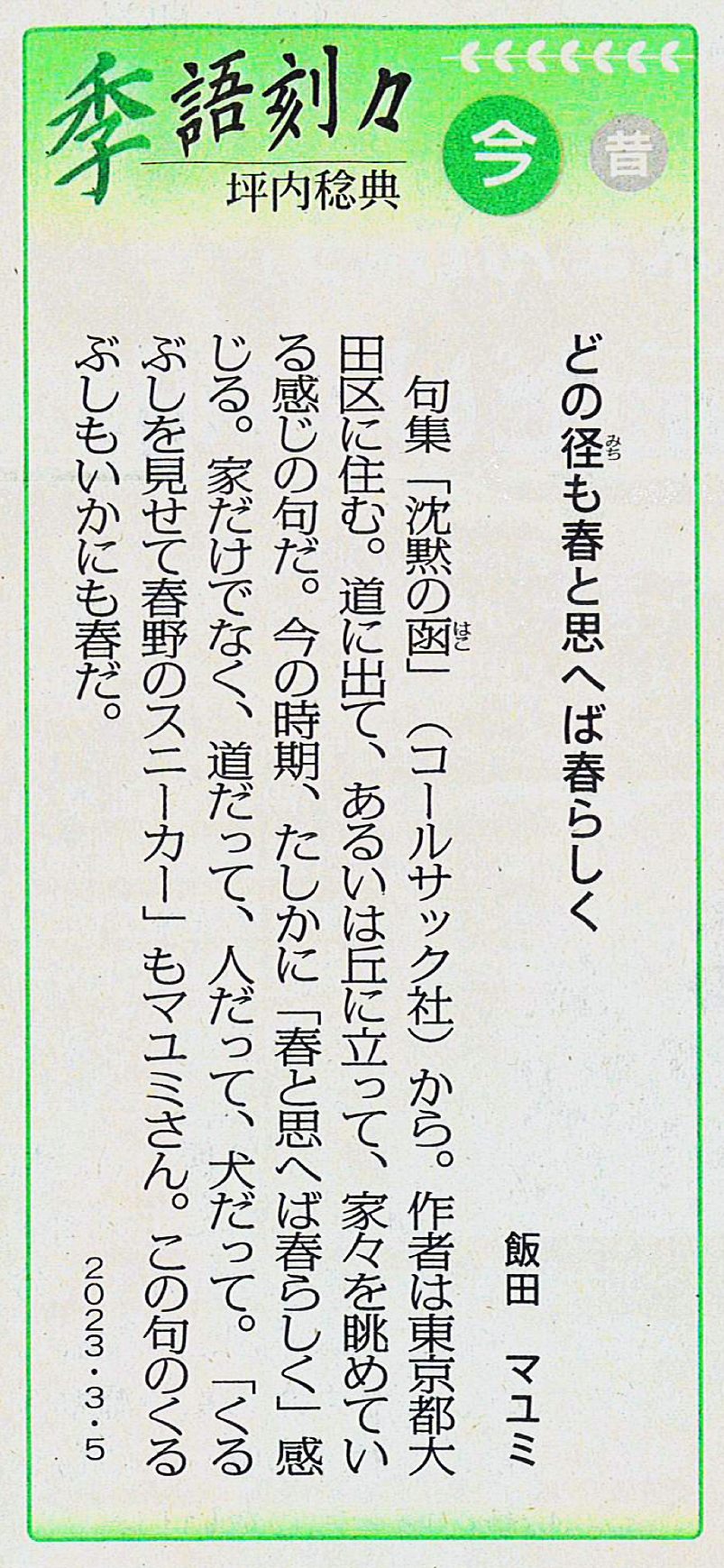 | 2023年03月05日 | 飯田マユミ句集『沈黙の函』が、毎日新聞で取り上げられました |
